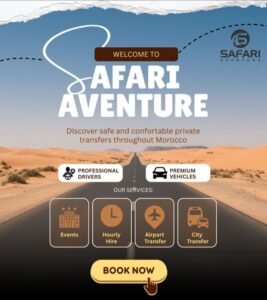 Welcome to Safari Aventure – your trusted partner for seamless and professional transfer services across Morocco. Whether you need a comfortable airport transfer, a city-to-city journey, or an hourly service tailored to your schedule, we’ve got you covered. With a focus on reliability, comfort, and exceptional service, we aim to make every journey memorable.